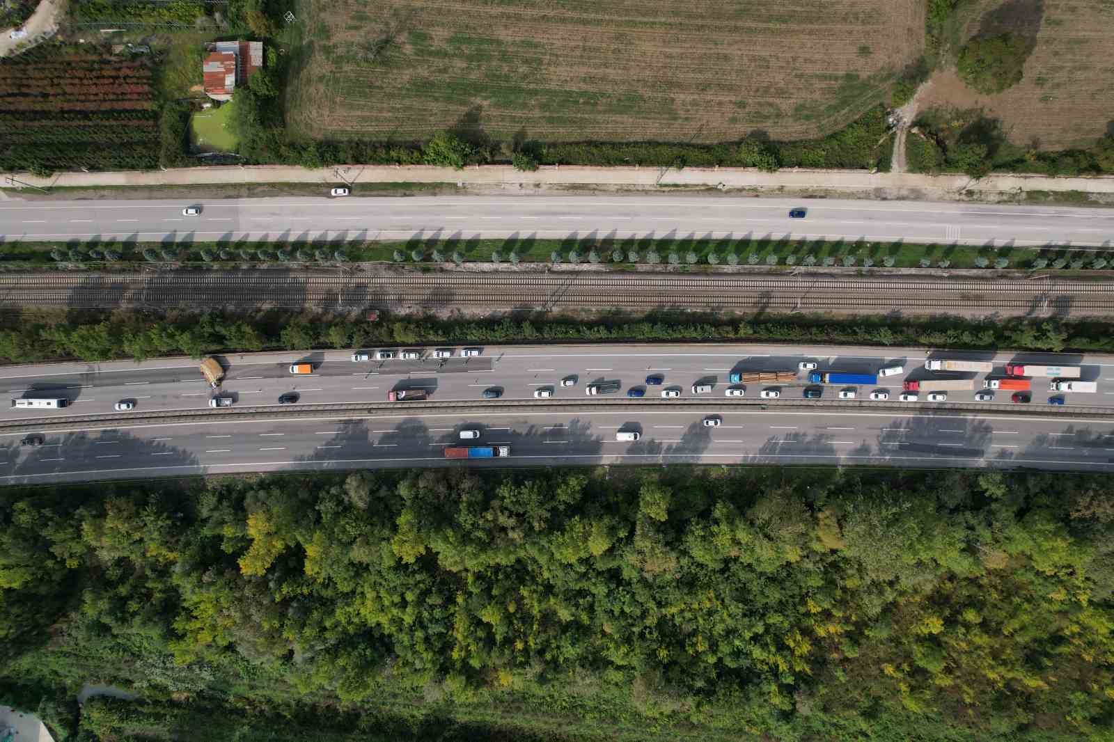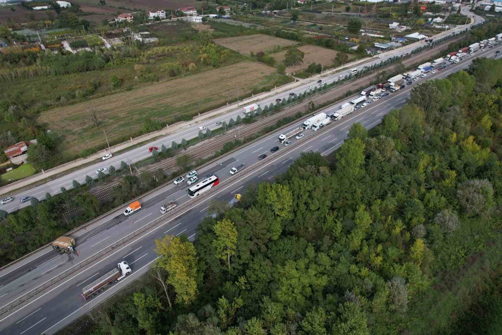 Anadolu Otoyolu Sakarya geçişinde kontrolden çıkan kamyonet yan yattı. Otoyolun İstanbul istikametinde uzun araç kuyrukları oluşurken, olay yeri havadan görüntülendi.