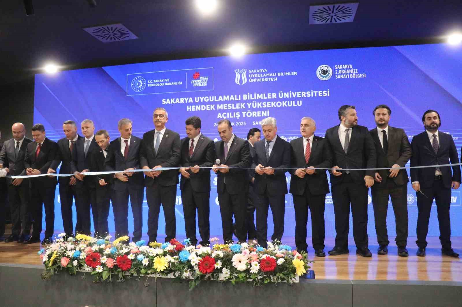 Sakarya Uygulamalı Bilimler Üniversitesi Hendek Meslek Yüksekokulu Açılış Töreni, Sanayi ve Teknoloji Bakanı Mehmet Fatih Kacır’ın katılımıyla gerçekleştirildi. Hendek ilçesi Organize Sanayi Bölgesinde inşa edilen yüksekokulun açılışında konuşan Bakan Kacır, "Sanayisiyle, ticaretiyle ülkemizin lokomotif şehirleri arasında yer alan Sakarya’mızın üretim gücüne güç katacak yeni eğitim yuvamızın şehrimize, ülkemize hayırlı, uğurlu olmasını temenni ediyorum. Geleceğimizi emanet edeceğimiz gençlerimize geçmişin fotoğrafını sunmak; bugünün Türkiye’sinin inşa sürecini doğru şekilde anlatmak, onları yarınlara daha güçlü hazırlayacaktır. 23 yıl önce üretimi montaj sanayinin ötesine geçemeyen, kabiliyetleri bastırılan, gençlerinin girişimlerini ve hayallerini askıda bırakan anlayışın hâkim olduğu bir Türkiye tablosu vardı. Vakti zamanında Vecihi Hürkuş, Nuri Demirağ, Şakir Zümre gibi nice öncü ismin girişimlerinin akamete uğratılması, ülkemizden çıkacak her kıvılcımın ateşini henüz yanmadan söndürdü. Türkiye’ye yıllar yılı hem vakit kaybettiren hem de milletimizin özgüvenini bastıran "biz yapamayız" anlayışı, 23 yıl öncesine kadar sürdürüldü. Ancak ayağımıza vurulan bu prangalardan 23 yıl önce Cumhurbaşkanımızın liderliğinde kurtulduk. Özgüvenini tekrar kazanan, küllerinden yeniden doğan bu milletin hayallerini birer birer gerçeğe dönüştürdük. Güçlü, rekabetçi ve sürdürülebilir sanayi altyapısıyla, Ar-Ge ve inovasyon yatırımlarıyla, nitelikli insan kaynağıyla ülkemizi bölgesinde ve dünyada söz sahibi konuma taşıdık. Üretimde ve teknoloji geliştirmede attığımız uzun vadeli adımların neticesinde imalat sanayi katma değerimizi 41 milyar dolardan 241 milyar dolara yükselttik. Askeri insansız hava aracı üretiminde dünya lideri olduk. Ticari araç, güneş paneli, beyaz eşya gibi pek çok üründe Avrupa’nın önde gelen üreticisi konumunda yer alan bir Türk sanayii inşa ettik. Yıllık ürün ihracatımız, imalat sanayimizin öncülüğünde 36 milyar dolardan 270 milyar dolara çıktı. Türkiye bugün, Çin’den sonra Orta Avrupa’ya kadar uzanan kuşakta ürettiği ürün ve ihracat yaptığı pazar çeşitliliği açısından en rekabetçi ülkedir" dedi.