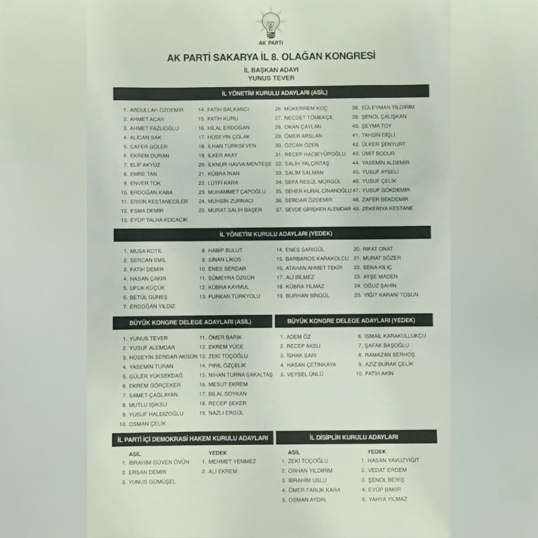 AK Parti Sakarya 8. Olağan İl Kongresi, Cumhurbaşkanı ve AK Parti Genel Başkanı Recep Tayyip Erdoğan'ın katılımıyla Serdivan Spor Salonu'nda gerçekleştirildi. Kongrede mevcut başkan Yunus Tever, tek listeyle girdiği seçimde 540 oyla yeniden il başkanlığı görevine seçilerek güven tazeledi. Tever’in yeni yönetim listesinde bir çok yeni isim dikkatlerden kaçmadı.