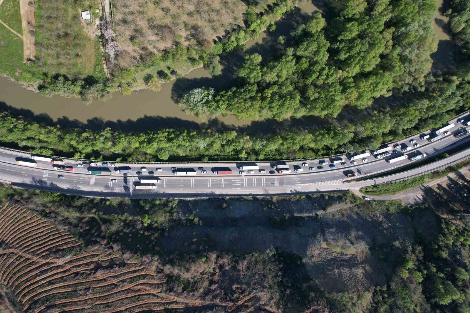 Kazaya ilişkin inceleme başlatılırken, bölgede oluşan trafik yoğunluğu havadan görüntülendi.