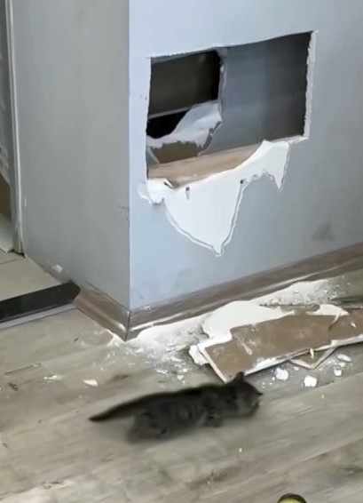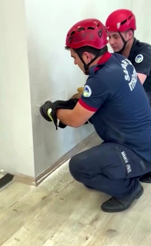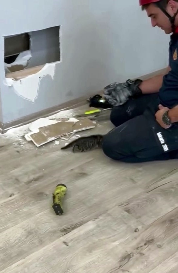Sakarya’da bir fabrika içerisinde alçıpan duvar arasına sıkışan yavru kedi, itfaiye ekiplerinin müdahalesi ile kurtarıldı.