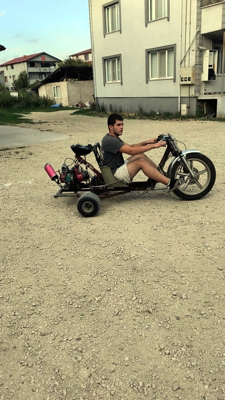 Emeği için gözyaşı döken Mert Ali Kurt ise, "Öncelikle bu süreç ortaokulda başladı. Ortaokulda arkadaşlarımızla hayallerini kuruyorduk. Sanayiye gidip parçalarına bakıyor, gelir ve maliyetini soruyor, bu şekilde bir şeyler öğrenmeye çalışıyorduk. Geçtiğimiz yazın arkadaşlarımızla bu projeyi başlattık. Kendimiz bir bisikleti ortadan ikiye keserek bir şase yapmayı başarmıştık. Babamın da dediği gibi madem yapacaksak daha farklı ve güzel bir şey yapmak istedik. Bu işlerde de İzmit’te Veysel ağabeyimiz var o bize çok yardımcı oldu. Kaynak ve bilgi konusunda. Bu süreçte onun gibi yanımda olan herkese teşekkürlerimi iletiyorum. Motoru Konya’dan, diğer parçaları Ankara ve Bursa olmak üzere ülkenin farklı farklı noktalarından geldi. Bir taslak çıkardık ortaya ve bu aracı bir şekilde yapmayı başardık. Arabanın ismi drift trike yani drift aracı diye geçiyor. Normalde trafiğe çıkılması yasak. Ben bunu trafiği kapalı alanlarda kullanmak için yaptım. Top sahasında sürüyordum. Oraya sürmek için giderken jandarmaya yakalandım. Jandarmayı görür görmez elim ayağım boşaldı zaten. Kaskım vardı onu çıkardığım gibi ağlamaya başladım zaten. Henüz 15 yaşındayım ve binbir zorluk çekerek kendi imkanlarımla yaptığım emeğimin gitmesine çok üzüldüm. Aracı bağladılar, ceza yazdılar. O üzüntü esnasında ekiplerin dahi yüzünü hatırlamıyorum, orada emeğimden dolayı ağladım onu hatırlıyorum" şeklinde konuştu.