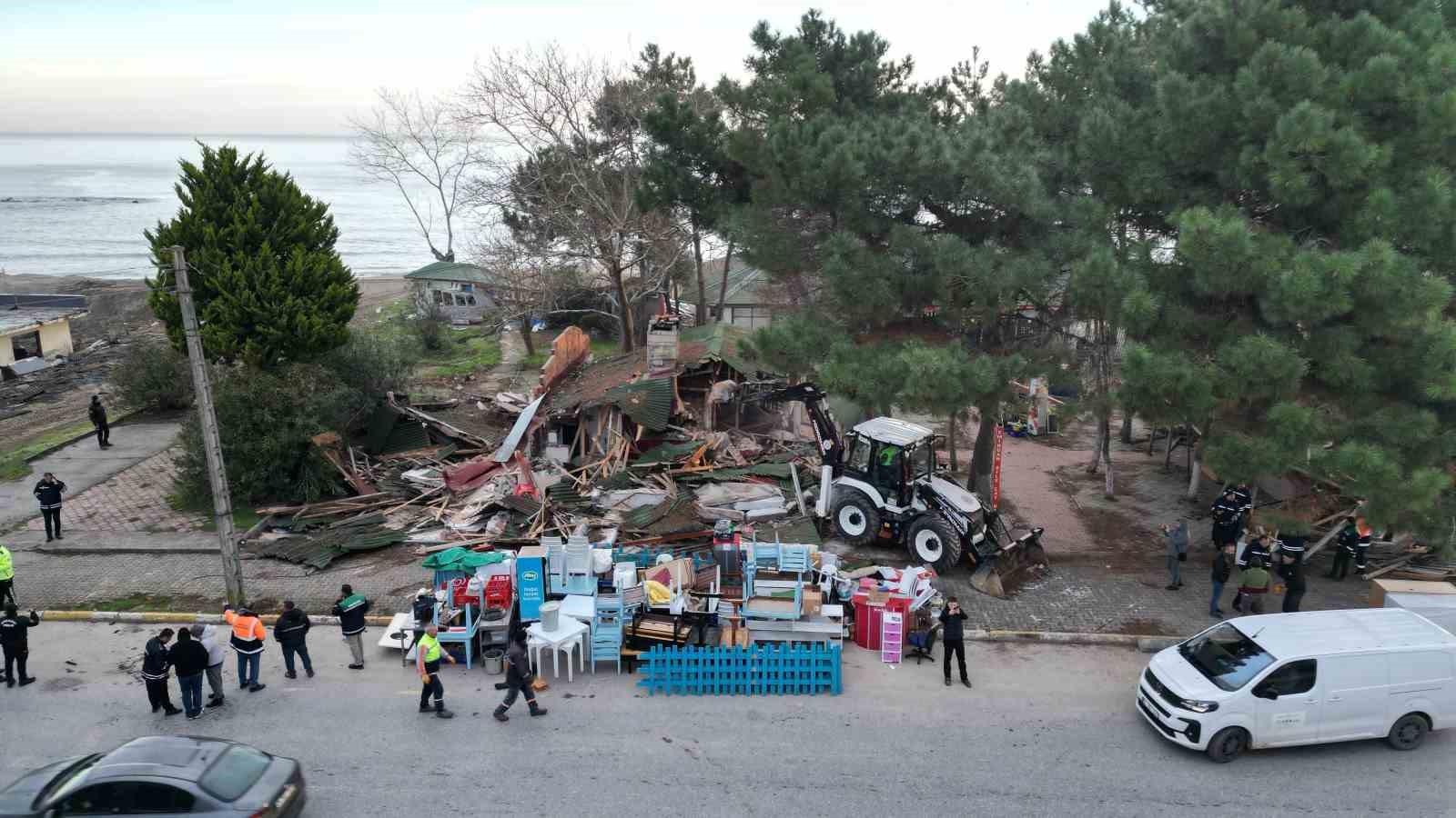 Karasu’da "riskli alan" ilan edilen bölgedeki binalar için kepçeler sahile indi