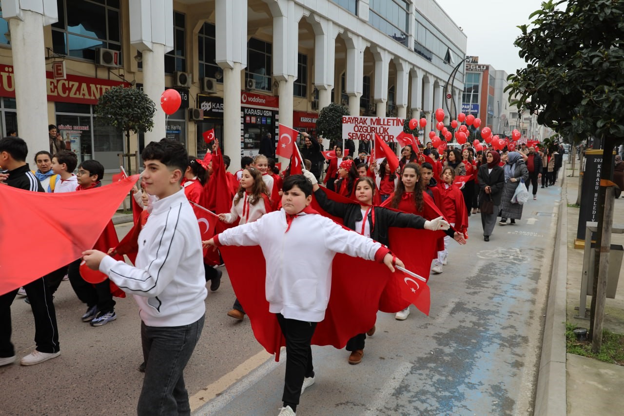 Sakarya’nın Karasu ilçesinde öğrenciler, "Bayrak Sevgisi" teması kapsamında düzenlenen yürüyüşte ellerinde Türk bayraklarıyla ilçe sokaklarını kırmızı beyaza bürüdü.