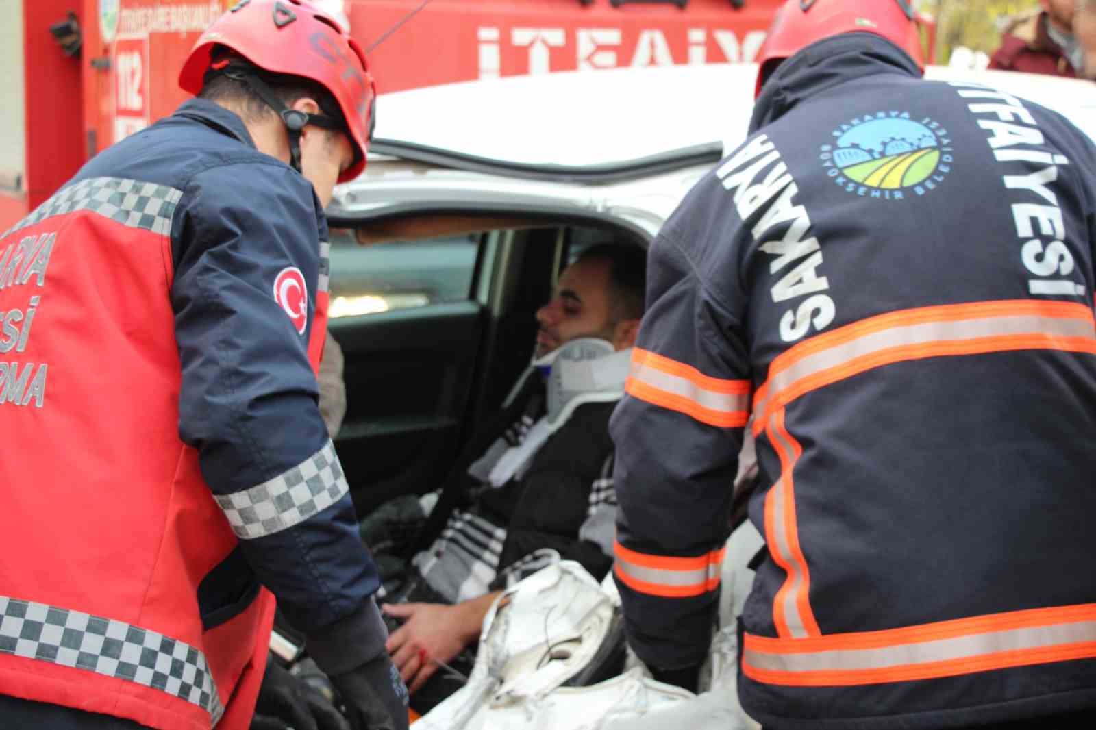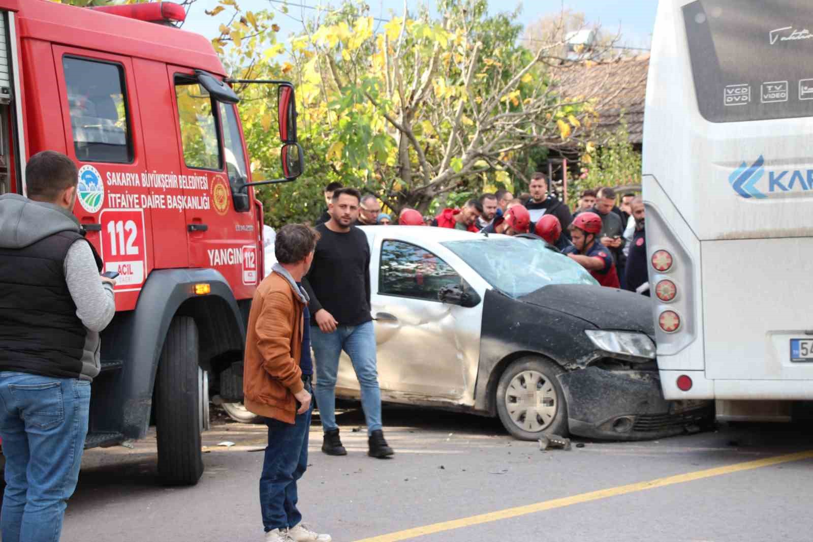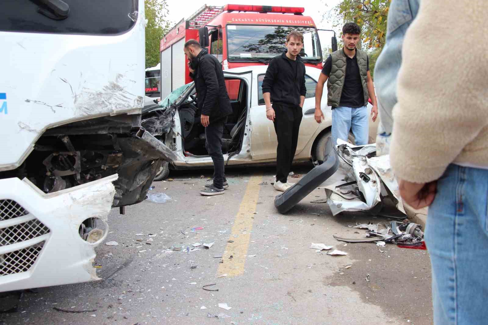 Edinilen bilgiye göre, Ada Caddesi Vakıf Mahallesi mevkiinde, önünde yavaşlayan 54 AFG 030 otomobile arkadan çarparak manevra yapan U.K. idaresindeki 54 S 2135 servis midibüsü, karşı yönden gelen U.S.G. idaresindeki 54 BZ 322 plakalı otomobille de kafa kafaya çarpıştı. Kazada işçiler panik yaşarken otomobil sürücüsü araç içinde sıkışarak yaralandı. Durumun haber verilmesi üzerine bölgeye itfaiye, sağlık ve jandarma ekipleri sevk edildi. Olay yerinde gelen itfaiye ekipleri, yaralı sürücüyü bulunduğu yerden kurtararak sağlık ekiplerine teslim etti. Olay yerinde yapılan ilk müdahale sonrasında sürücü hastaneye sevk edildi. Hususa ilişkin inceleme başlatıldı.