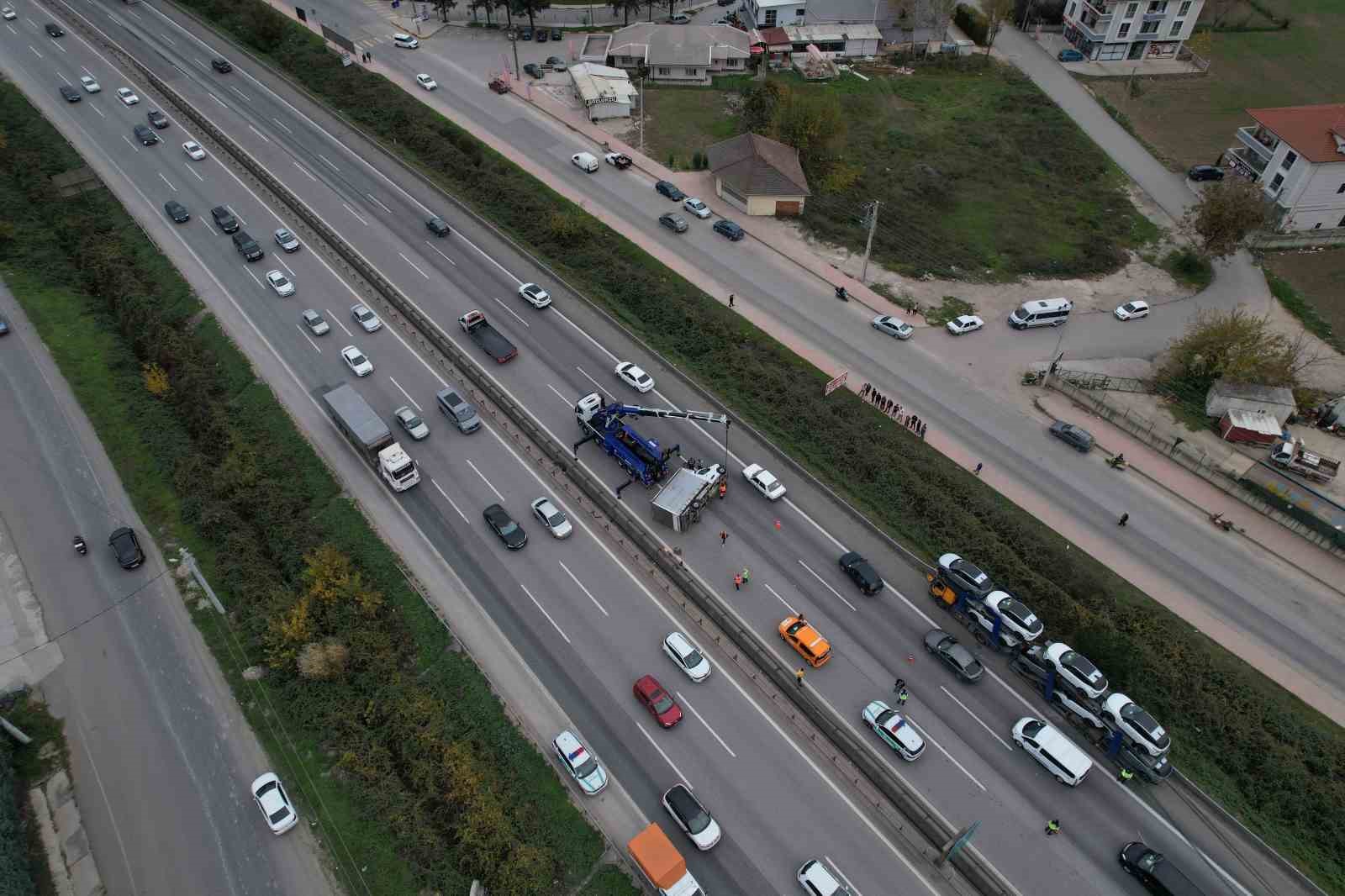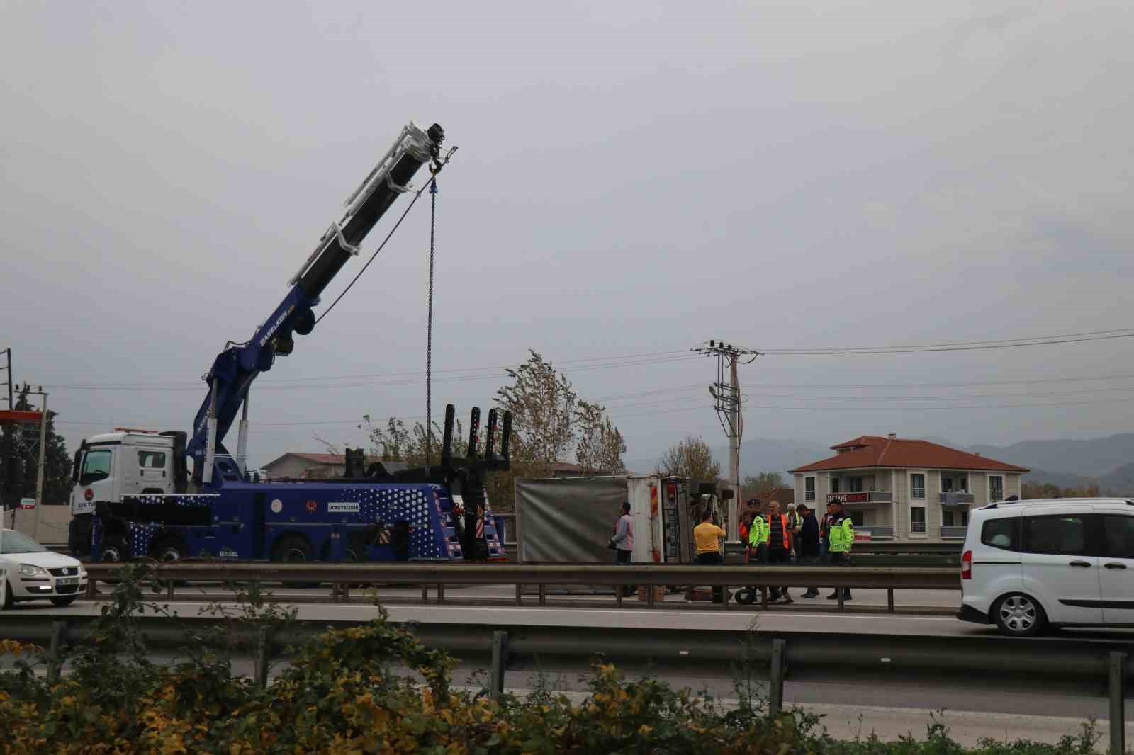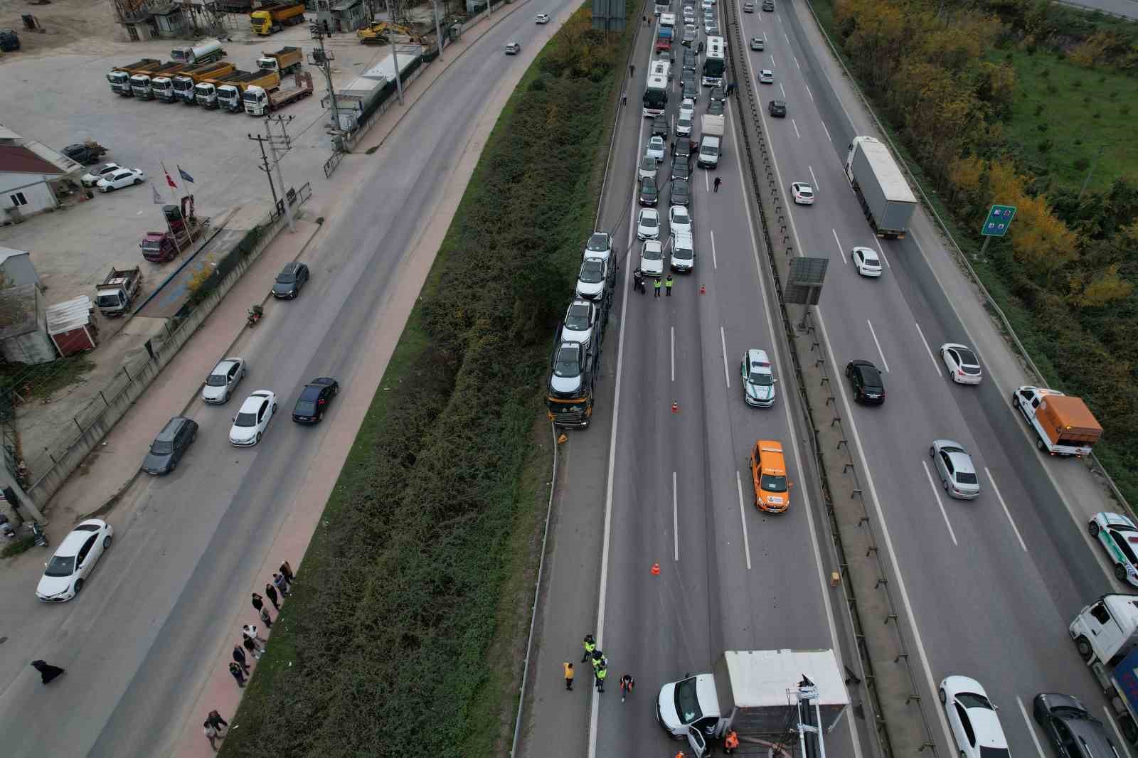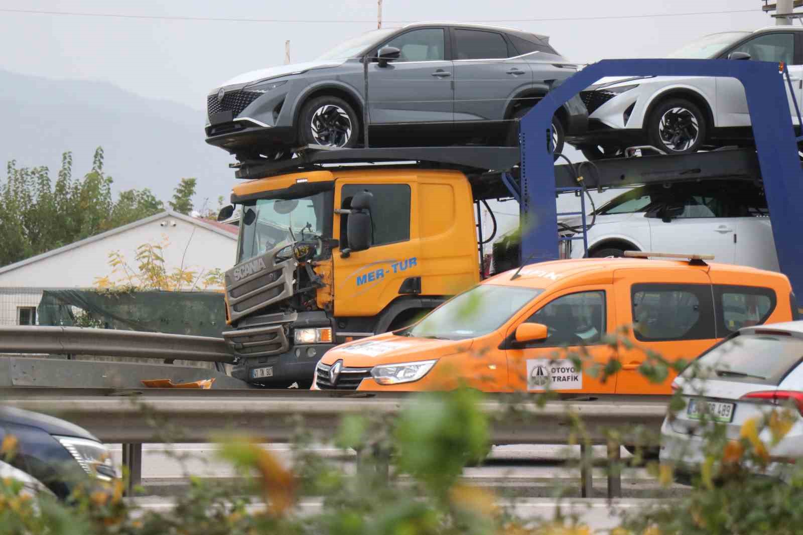 Anadolu Otoyolu Sakarya geçişinde SUV tarzı araç yüklü tır ile çarpışan nakliyat kamyoneti devrildi. Kazada yaralanan olmazken, otoyolun Ankara istikametinde kilometrelerce araç kuyruğu oluştu.