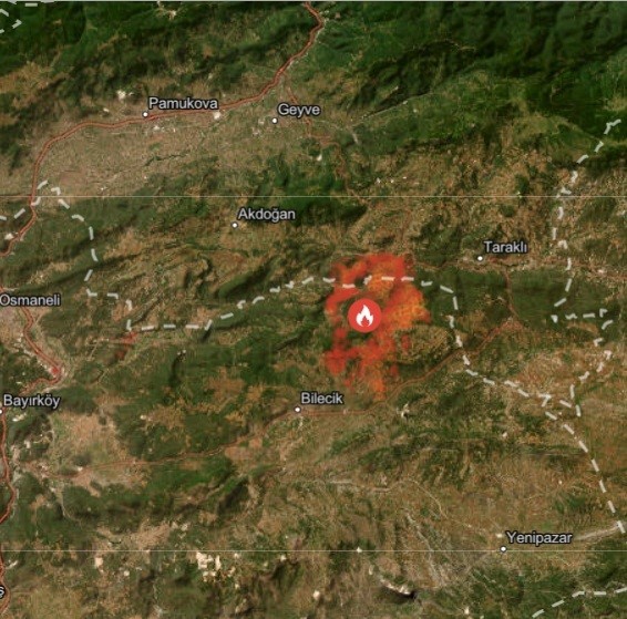 Sakarya’nın Taraklı ilçesinde başlayıp Bilecik’e sıçrayan ve birçok köyün tahliyesine sebep olan orman yangınının etkisi uydudan da net şekilde görüldü. Yangın, 5’inci gününde soğutma çalışmalarıyla kontrol altında tutulurken, kül olan yüzlerce hektar alan ve ağır hasar dron ile havadan görüntülendi.