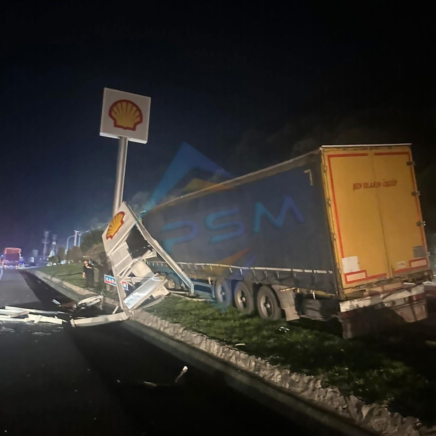 Sakarya’nın Geyve ilçesi D-650 kara yolunda kontrolden çıkan tır, yön tabelasına çarptıktan sonra akaryakıt istasyonuna girdi.