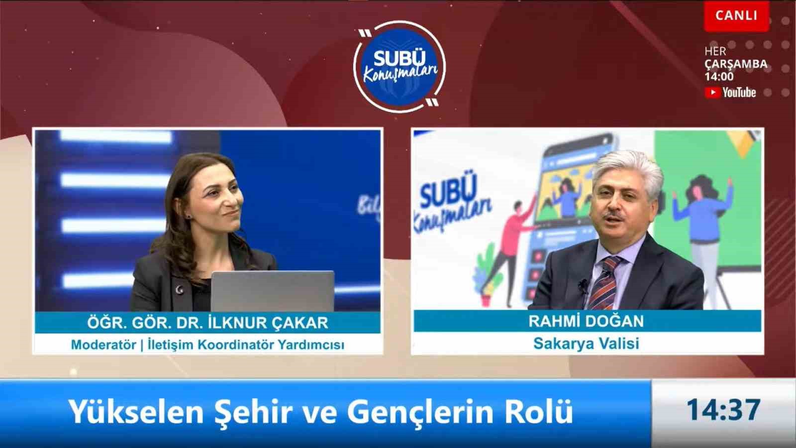 Sakarya Uygulamalı Bilimler Üniversitesi (SUBÜ) tarafından düzenlenen SUBÜ Konuşmaları’nın 108’nci konuşmacısı, ‘Yükselen Şehir ve Gençlerin Rolü’ konulu söyleyişiyle Sakarya Valisi Rahmi Doğan oldu. Moderatörlüğünü İletişim Koordinatör Yardımcısı Öğretim Görevlisi Dr. İlknur Çakar’ın üstlendiği söyleşide; Sakarya’nın öğrenciler için sunduğu avantajlar, öğrencilerin şehirle güçlü bağlar kurabilmesi için planlanan kültürel ve sosyal projeler, afet yönetiminde hedeflenen dönüşümler ile yerel yönetimlerin ve üniversitelerin rolü ele alındı.