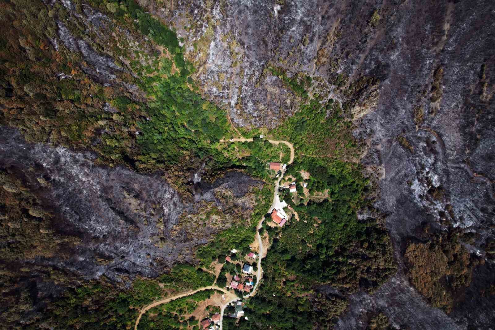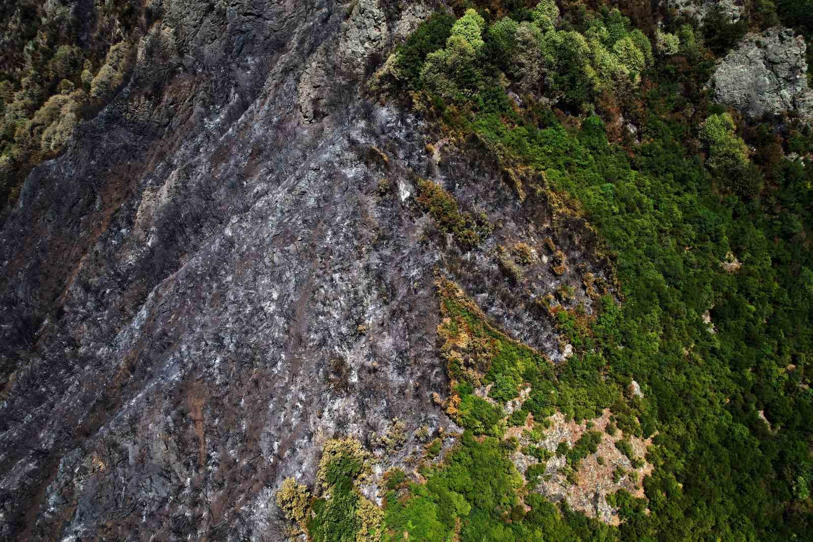 Yangının söndürülmesinden iki gün sonra verilen hasar da gözler önüne serildi. Bir tarafta yeşilin, diğer tarafta siyahın tonlarının olduğu alan havadan görüntülendi.